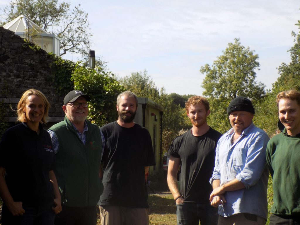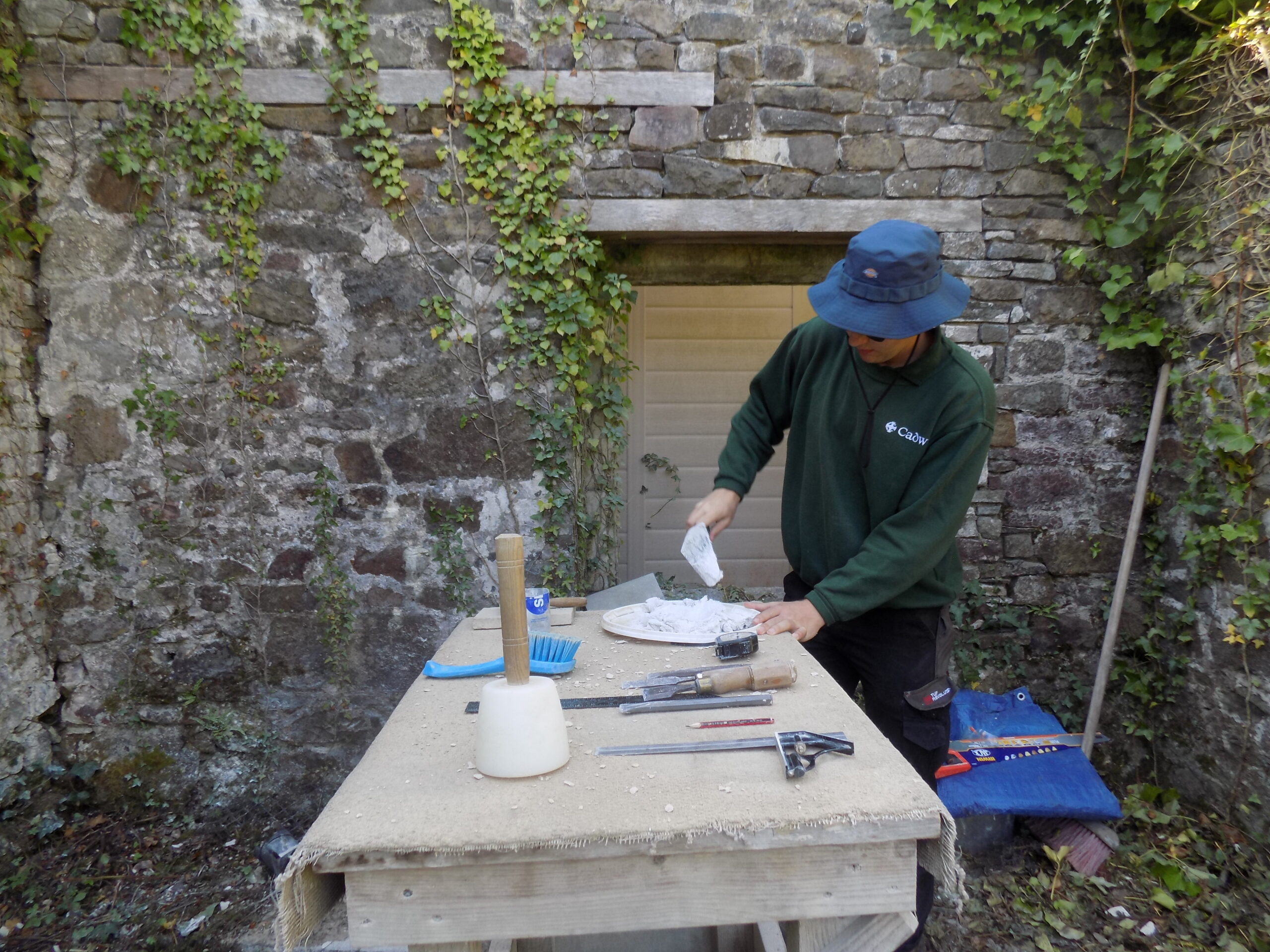 Felly rydym wedi bod yn falch iawn o groesawu tîm ‘Canolfan Tywi’ o arbenigwyr adeiladau traddodiadol, i helpu gyda’n cynlluniau parhaus i achub y rhan bwysig hon o dreftadaeth adeiledig yr Ardd. Wedi’i leoli’n lleol yn Llandeilo, mae’r tîm yn cynnal hyfforddiant ac yn rhoi cyngor i gefnogi pawb dan haul sy’n gofalu am adeiladau hanesyddol ledled Cymru (Hafan | Canolfan Tywi.) Daethom at ein gilydd ar y safle i sgwrsio â Helena Burke (Swyddog Sgiliau a Phrosiectau Treftadaeth y Ganolfan), Olly Coe (Pen-saer Maen a Chyfarwyddwr Coe Stone Ltd.) a thri dysgwr, sydd ar hyn o bryd yn dilyn NVQ3 mewn Gwaith Maen Treftadaeth yng Nghanolfan Tywi. Y dysgwyr yw Chris Haxton o Wessex Conservation Company, Max Dixon o Jones and Fraser Ltd, a Matthew James o Cadw.