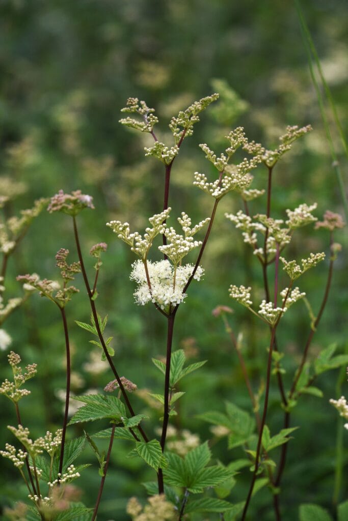 Mae’r planhigyn cyntaf yr hoffwn ganolbwyntio arno yn un a welwn yn weddol aml yr adeg hon o’r flwyddyn, sef Filipendula ulmaria neu, o’i alw’n ôl ei enw mwy adnabyddus, Erwain. Mae’n bosibl y byddwch wedi ei weld yn tyfu mewn perthi, coetiroedd neu ddolydd yn eich ardal, yn enwedig os ydynt yn fannau llaith. Mae’n blanhigyn sy’n dal y llygad yn go iawn yn fy marn i oherwydd ei flodau mawr gwyn hufennog sy’n siglo yn yr awel, ac oherwydd ei arogl melys, er nad yw hwnnw at ddant pawb chwaith!